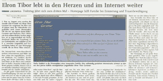 Rheinpfalzbericht vom 24.08.2006 LINGENFELD. Den 24. August 2003 werden die Familie sowie die zahlreichen Freunde und Bekannten von Elron Tibor Gerstner nie vergessen: Im Alter von 18 Jahren verstarb der lebensfrohe Lingenfelder an den Folgen eines Motorradunfalls. Die Art und Weise, wie dessen Mutter Karin Heber-Gerstner und Stiefvater Peter Heber mit dem schmerzlichen Verlust umgehen, ist ungewöhnlich, jedoch sehr beeindruckend: Neben der Errichtung einer Gedenkstätte am Unfallort, an der K 31 zwischen Lingenfeld und Germersheim, haben sie eine Homepage erstellt, die an Elron Tibor erinnert. Die Internet-Seite, die unter der Adresse "www.elron-tibor.de" aufgerufen werden kann, umfasst Infos und Bilder von dessen Kindheit sowie Jugend, seinen Hobbys bis hin zum Unfallort, der Beerdigung und der letzten Ruhestätte. Weiter sind Briefe an die Eltern und Gedichte von Elron Tibor dort zu finden. Interessenten stoßen auf die in Worte gefassten Gefühle seiner Mutter, erfahren Wichtiges über das Thema "Trauer", können sich ins Gästebuch eintragen oder direkten Kontakt mit der Familie aufnehmen. "Es gibt große Unterschiede bei der Auffassung über die Trauerbewältigung: Ob man nur voll Hass und Zorn ist oder in Liebe an das Leben und die guten Taten des Verstorbenen denkt und diese Liebe in einem selbst weiter leben lässt", sagt Karin Heber-Gerstner und gibt im Gespräch mit der RHEINPFALZ an, einen "eigenen Weg gewählt" zu haben. Elron Tibor sei sehr aktiv gewesen und habe durch seine offene, menschenfreundliche und hilfsbereite Art viele Freunde gewonnen. "Er hat sich früh auch für andere engagiert und war für sein Alter sehr reif", pflichtet Stiefvater Peter Heber bei. Die guten Kontakte zu Elron Tibors großem Freundeskreis bestünden noch heute: "Sie kommen zu uns ins Haus, und wir genießen das sehr. Wir ernten heute das, was er über Jahre aufgebaut hat", beschreibt Peter Heber sein "Gefühl der Dankbarkeit". Die Nachricht über den Tod ihres Sohnes sei sehr schlimm gewesen, verhehlt Karin Heber-Gerstner nicht: "Ich glaube, dass jeder ein Buch hat, in dem sein Schicksal steht. Sein Buch war vor drei Jahren beendet". Eine Freundin von Elron Tibor habe sie auf Internet-Seiten von Familien aufmerksam gemacht, die das gleiche Schicksal ereilt habe. "Ich habe mir das angeschaut und war begeistert, dass die Erinnerungen auf diese Weise für jeden zugänglich sind. Ich wusste, was ich wollte und habe entsprechende Texte verfasst." Ein Jahr nach Elron Tibors Tod sei die Seite eingerichtet worden. Diese soll "eine Hilfe für alle sein, mit der Trauer umzugehen", so die Mutter: "Wir wollen nicht nur trauern, sondern die Seite soll daran erinnern, wie er war, was er wollte, was er tat und wie viel Liebe er gegeben hat". Die Seite werde auch von der Familie genutzt: "Wir lesen uns die Inhalte immer wieder durch, um uns sein Leben ins Gedächtnis zu rufen. Dann ist Elron Tibor noch näher bei uns", fügt dessen Stiefvater an. Dieser Glaube tue seiner Familie gut: "Wir können mit ihm reden, ganz gleich, wo wir sind, er ist immer bei uns". Trauer sei nicht von heute auf morgen zu vergessen. Besonders stark sei diese an Feiertagen und Familienfeiern, gibt Karin Heber-Gerstner zu. Die Aussage von Personen, man müsse doch irgendwann mit dem Verlust eines Angehörigen abgeschlossen haben, bezeichnet sie als "Taktlosigkeit Trauernden gegenüber": "Das Verständnis ist sehr rar. Die Leute haben Angst vor dem eigenen Tod und schieben das Thema weg". Die Homepage sei auf eine große Resonanz gestoßen. Über 17.200 Zugriffe aus Deutschland sowie auch aus dem Ausland würden dies belegen. Ebenso habe man Anrufe bekommen, offene Gespräche mit Leidensgenossen geführt und auch anderen dabei Mut gemacht. Laut Peter Heber gab es auch Anfragen von Personen, ob sie gewisse Passagen der Homepage übernehmen dürften. "Da haben wir nichts dagegen. Dies zeigt nur, dass wir es gut gemacht haben". Die Homepage sei auch in Elron Tibors Sinne: "Das hätte er zu Lebzeiten akzeptiert", ist sich seine Mutter sicher. Auch die positive Resonanz seiner Freunde zeige, "dass der gegangene Weg der richtige war". Nur bei wenigen Menschen sei die Homepage auf "ein gewisses Unverständnis" gestoßen, da Familienangelegenheiten so offen dargelegt würden und die Seite einen zu starken Einblick in die Privatsphäre gewähre. Nach drei Jahren Trauerzeit wolle man die Internetseite um einen Beitrag erweitern und "ein Resümee ziehen, wie es uns in diesem Zeitraum ergangen ist", informiert Peter Heber: "Was kann mir passieren, außer dass ich denjenigen, den ich verloren habe, wiedersehe", beschreibt er eindrucksvoll seine Gedanken über den Tod. Das Schlimmste sei, wenn Leute in Gesprächen das Schicksal von Elron Tibor bewusst ignorieren: "Uns ist lieber, wenn das Thema angesprochen wird und Elron Tibor erwähnt wird", so die Eheleute: "Man muss sich mit der Trauer beschäftigen und sie durchleben: Den eigenen Tod stirbt man, aber mit dem Tod der anderen muss man leben. Wir versuchen daher so offen wie möglich mit der Trauer-Thematik umzugehen, um anderen zu zeigen, das Leben geht weiter". Seit dem Tod von Elron Tibor würden sie viel intensiver und bewusster leben, erzählen die Eheleute: "Wir können uns nun auch über Kleinigkeiten freuen und nehmen uns viel Zeit füreinander." Dies fehle vielen Menschen heutzutage. Drei Jahre nach dem Tod ihres Kumpels werden heute wieder zahlreiche Freunde und Bekannte mit Elron Tibors´ Familie den Friedhof besuchen. Im letzten Jahr ließen sich 15 Jugendliche diesen für sie wichtigen Gang nicht nehmen. (nti) |